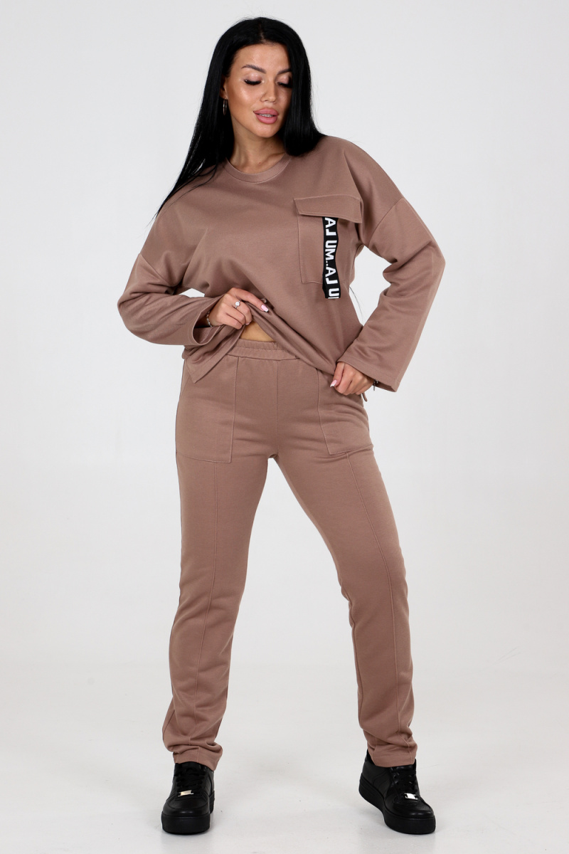 Женский костюм двойка с брюками представляет собой идеальное сочетание стиля и комфорта. Изготовленный из прочной и мягкой трех нитки, этот костюм обеспечивает идеальное сочетание прочности и приятности на ощупь. Туника костюма имеет свободный крой, который позволяет свободно двигаться и не сковывает движения. На полочке туники расположен практичный нагрудный карман, который поможет хранить необходимые мелочи под рукой. Декоративная лента, пришитая по карману и по спинке изделия, придает цельности и оригинальности этому стильному костюму. Особенности полочки изделия, которая короче спинки, и боковые разрезы придают дополнительную элегантность и легкость образу. Кроме того, спущенные рукава делают этот костюм еще более стильным и привлекательным. Брюки костюма имеют удобную резинку, благодаря чему идеально садятся на фигуру и не стесняют движения. Боковые карманы обеспечивают дополнительный комфорт и функциональность. Костюм доступен в двух привлекательных расцветках: коричневой и бирюзовой. Выбирайте цвет, ко